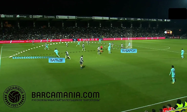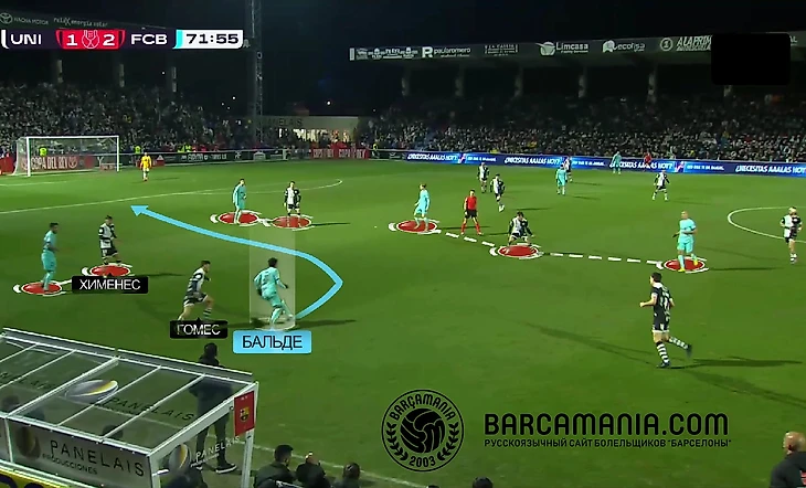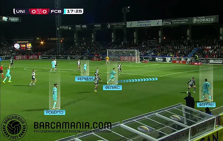 С точки зрения территориального преимущества мало что поменялось по сравнению с матчем против «Барбастро» – несмотря на достаточно смелый прессинг-план «Унионистаса», как только «Барселона» переходила на чужую половину поля, хозяева охотно прижимались к воротам.