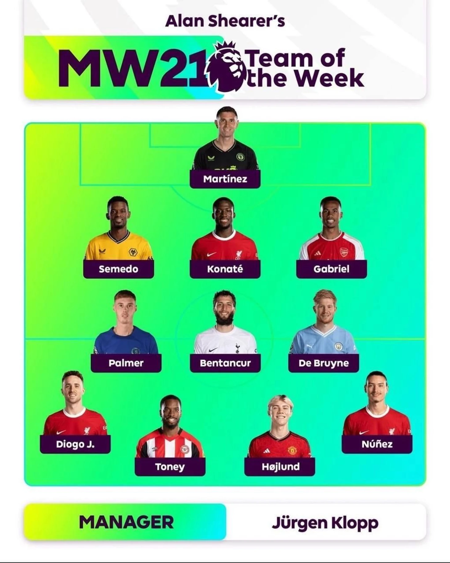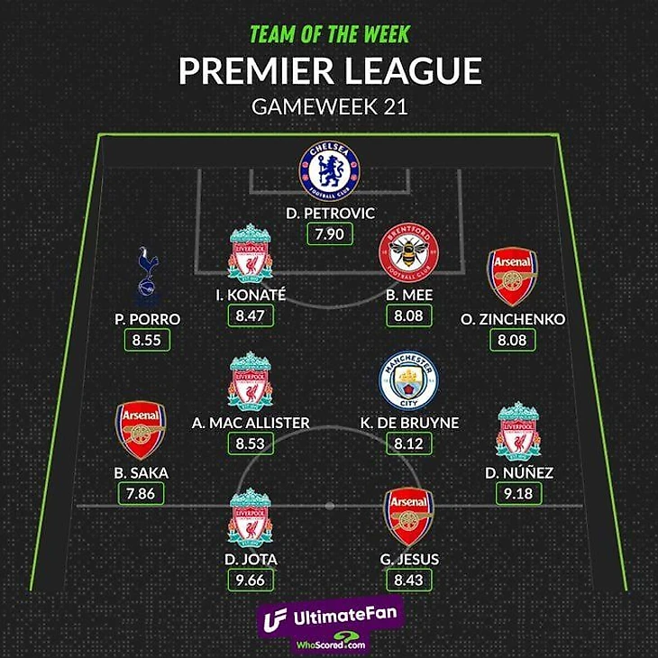 «Арсенал» и «Ливерпуль» разгромили своих соперников, поэтому их футболисты превалируют в составе. Любопытно, что Бен Ми стал единственным футболистом из команды не «большой шестёрки», хотя данное понятие с каждым сезоном становится всё неестественнее.