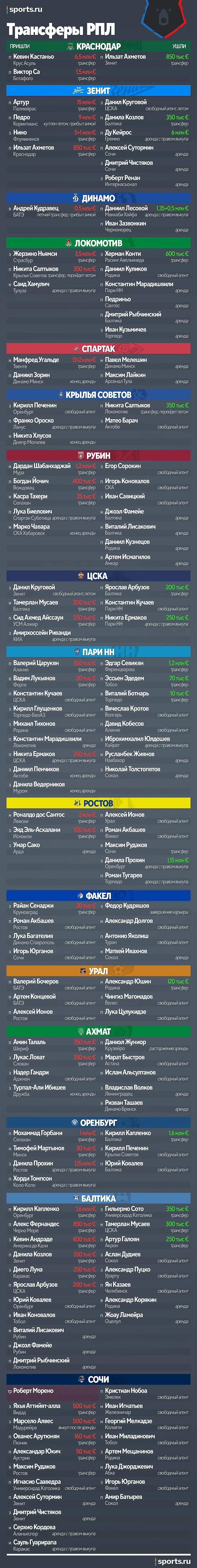 Таблица трансферов РПЛ: «Зенит» потратил больше всех, Кучаев ушел из ЦСКА в «Пари НН», 11 новичков «Балтики»