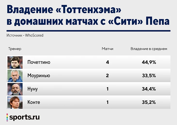 Последний (и единственный) раз Гвардиола обыгрывал «Тоттенхэм» дважды за сезон в эпоху, когда «шпорами» рулил Маурисио Почеттино. Его подход категорически отличался. Достаточно взглянуть на процент владения в домашних матчах с «Сити». Почеттино – единственный, у кого было больше 40%.