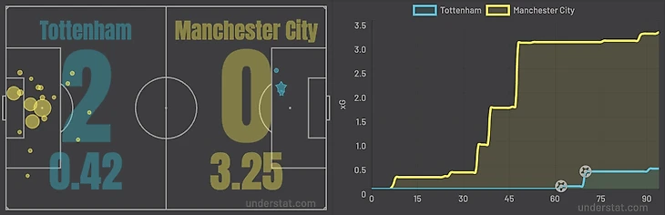 К тому моменту, как у «Сити» удалился Александр Зинченко, гости насоздавали моментов больше чем на 3 xG, тогда как «шпоры» даже ни разу не пробили по воротам. На этом невезение Пепа не закончилось. Голами у «Тоттенхэма» стали первые же два удара в большинстве.