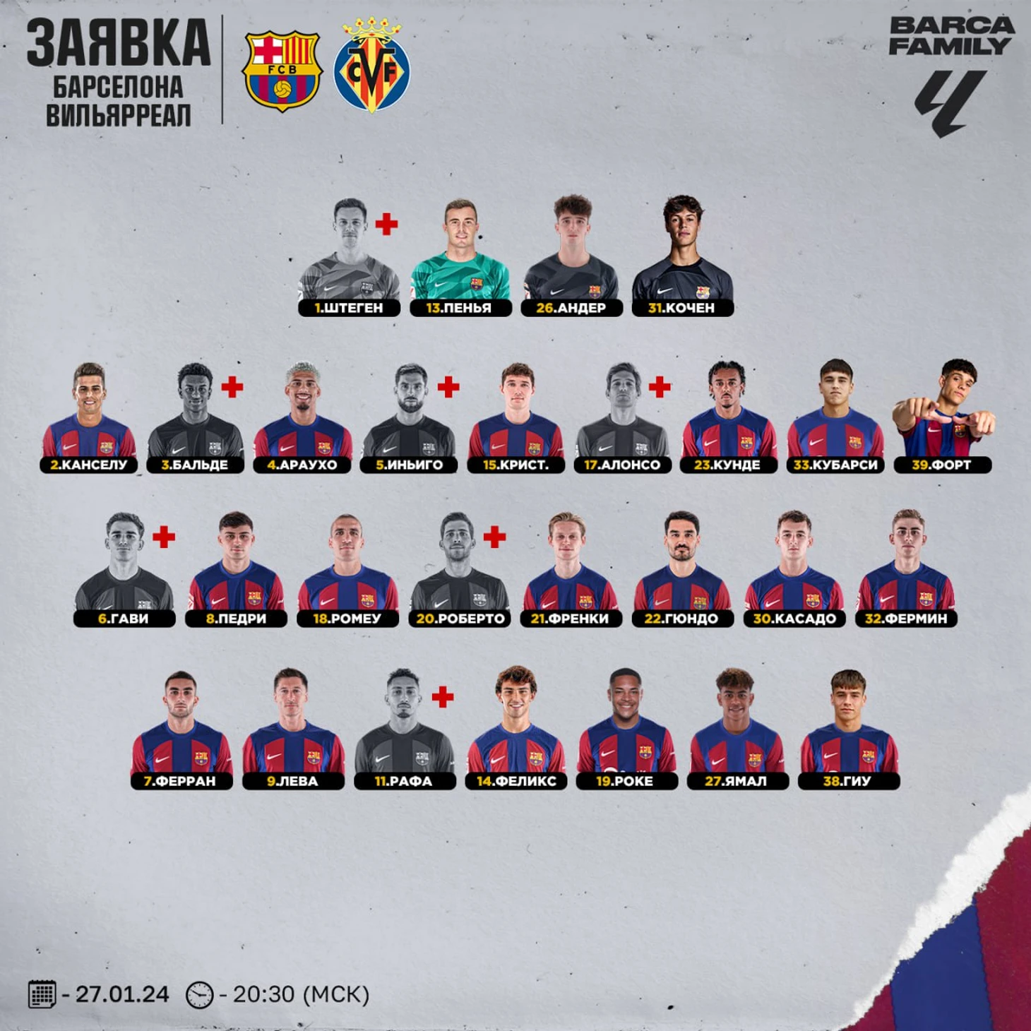 В заявку из-за травм не попадут: Гави, Бальде, Серджи Роберто, Маркос Алонсо, Иньиго Мартинес, Марк-Андре тер Стеген и Рафинья.