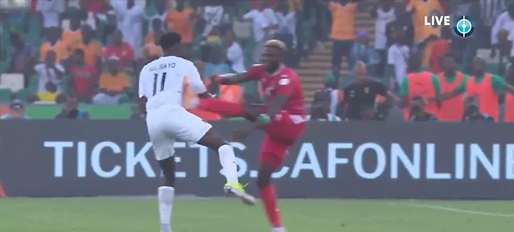 Давление продолжилось, а на 55-й Федерико Бикоро из Экваториальной Гвинеи удалился после каратистского приема против Мохамеда Байо. Выглядит страшно, хотя сам нарушитель еще спорил с судьей.