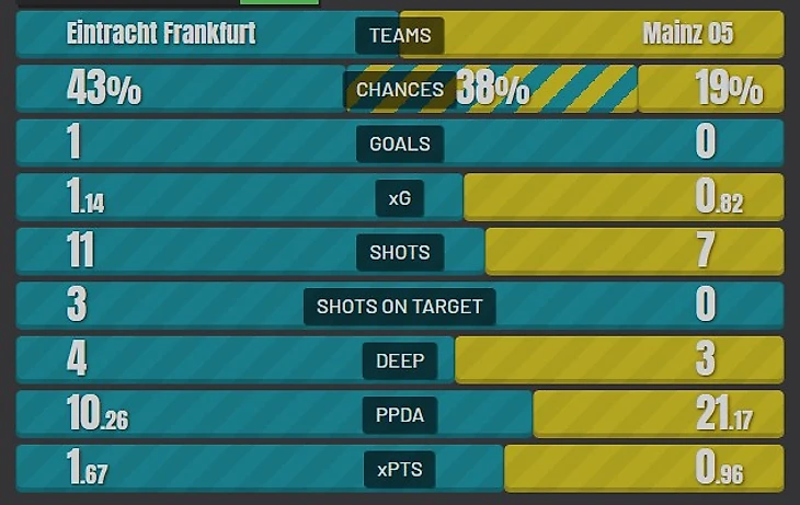 До финального свистка игра была «на тоненького», но хозяева выстояли и добыли важные три очка. Победа оставила «Айнтрахт» на шестой строчке и позволила приблизиться к дортмундской «Боруссии» на расстояние 2 очков. «Майнц» с 11 очками идет 16-м.