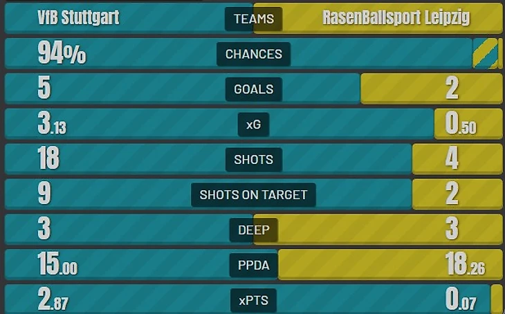 После перерыва ни «Штутгарт», ни сам Ундав и не думали останавливаться. Левелинг и Вагноман организовали гол в начале 2-го тайма, затолкав «быков» в собственной штрафной. Фирменный гол Опенда в контратаке ненадолго сократил отставание «Лейпцига» в счете до минимального, но Ундав продолжил избиение, оформив хет-трик. 5:2. Лучший перфоманс «Штутгарта» после рестарта и крайне подозрительный «Лейпциг», который после трех поражений кряду рискует пропустить вперед унылый «Дортмунд».