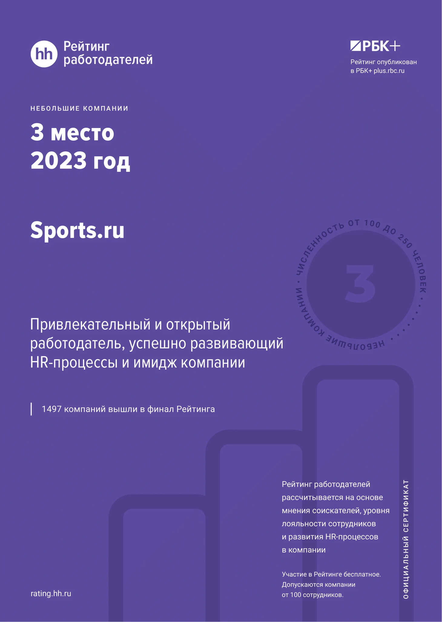 HeadHunter – главная площадка в России по поиску работы – объявил результаты Рейтинга работодателей. Спортс не только попал в ТОП-10, но занял почетное третье место 🤩