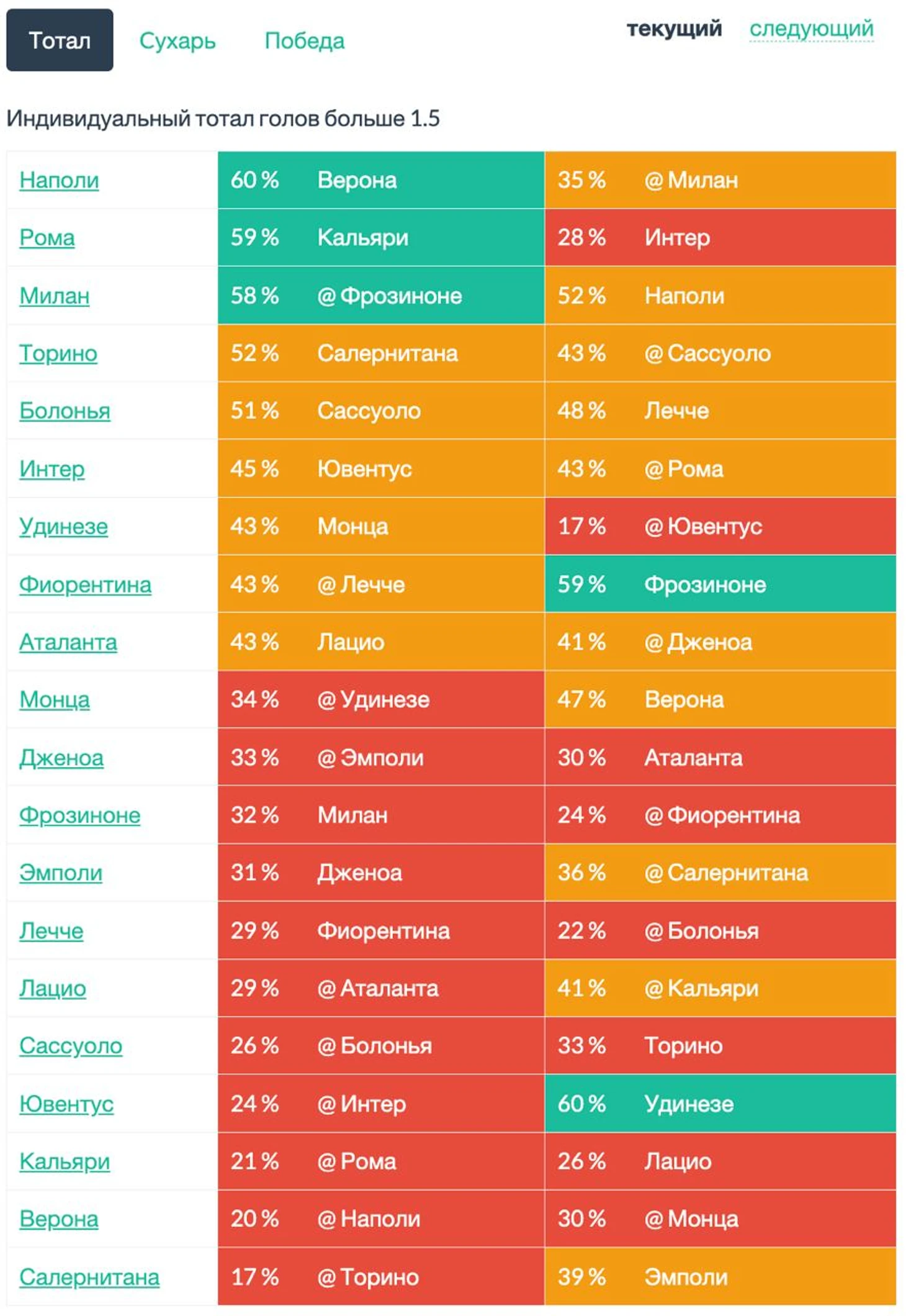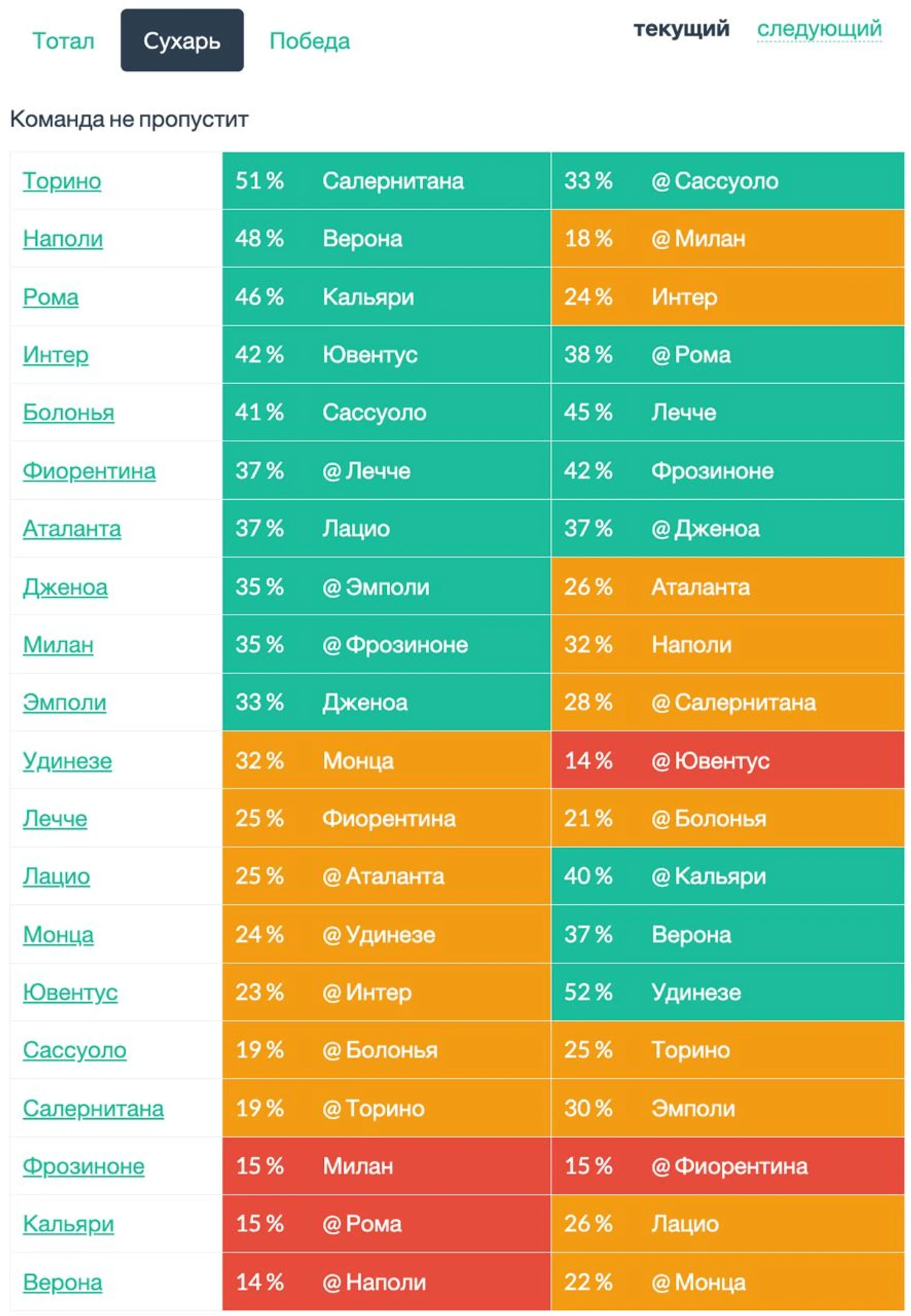 Традиционно много команд в «зелёной» зоне. Перечислять их не стоит, лучше подумать над тем, кто из них пропустит. Я думаю, «Лечче» и «Ювентус» - главные кандидаты на гол, всё же и «Фиорентина», и «Интер» небезгрешны в обороне. Отмечу 33% у «Эмполи» и 35% у «Дженоа» - какая-то аномалия, неужели букмекеры ждут 0:0? Слабо верится именно в такой исход.