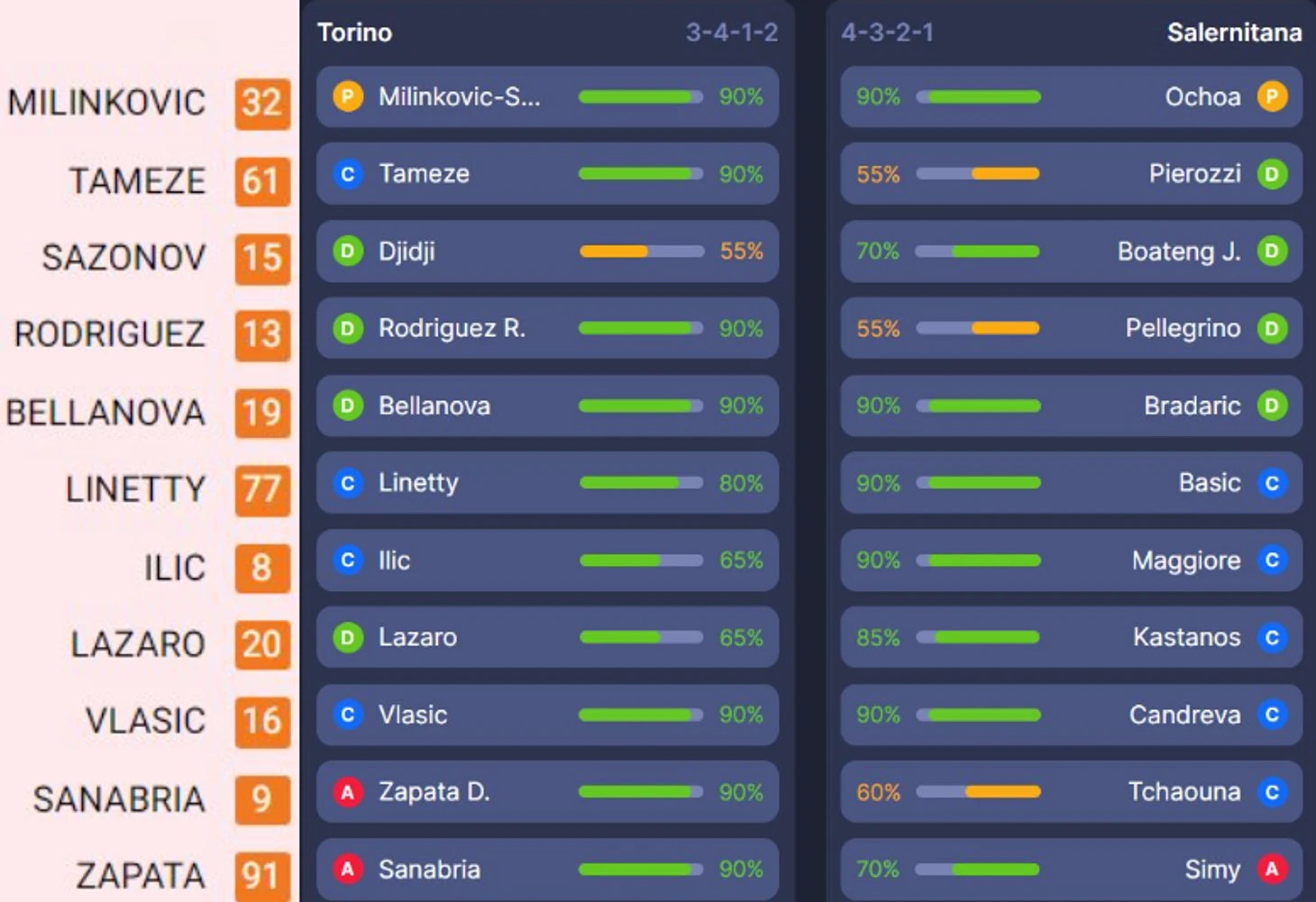 Важные нюансы: Обратите внимание на трёх игроков «Болоньи» с низкой вероятностью старта - их не стоит брать. Также у Пинамонти (нап, 7.5) всего 65% - опасно.