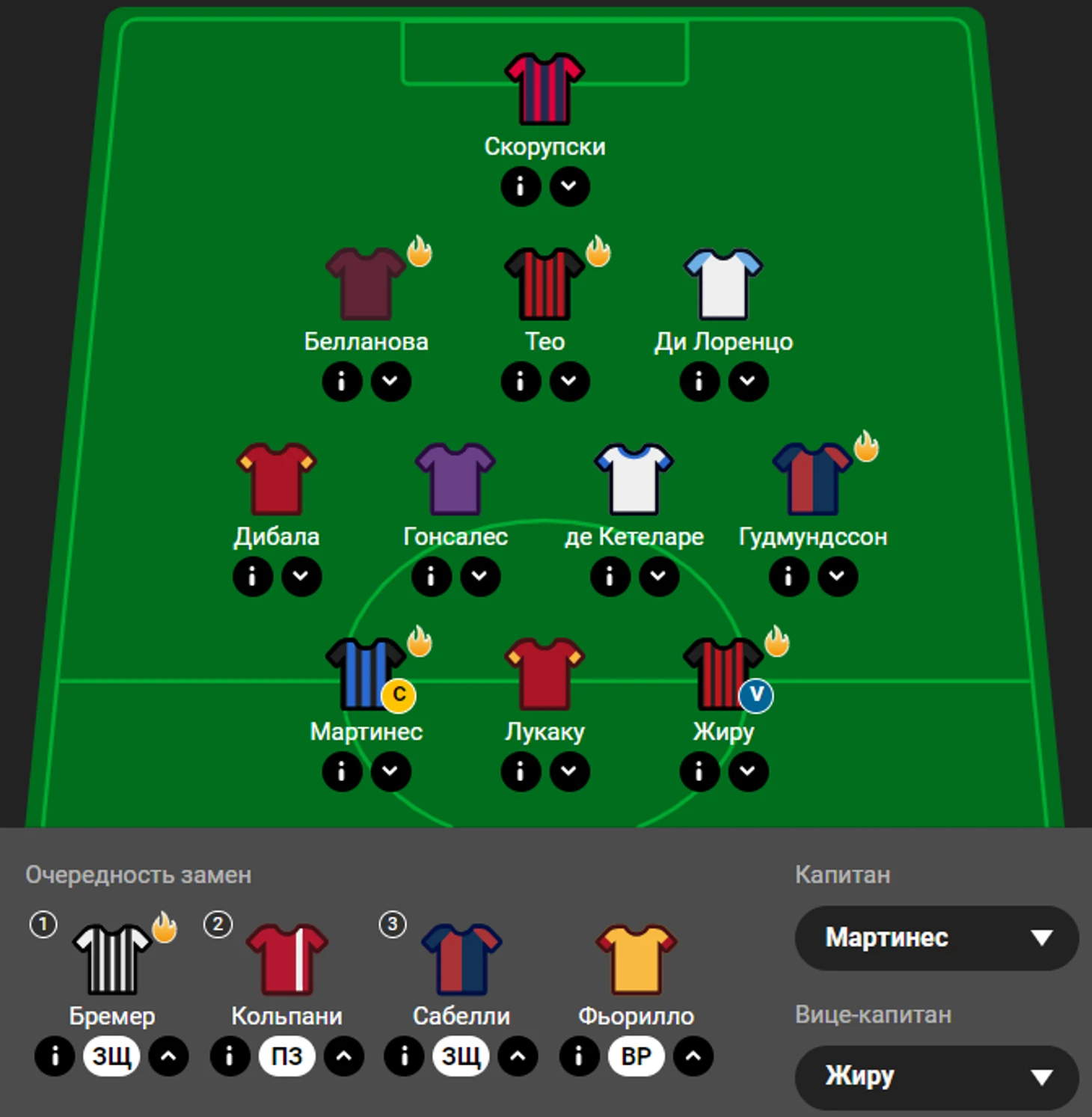 Один из важнейших матчей в сезоне - и непонятно, что от него ожидать. Обе команды очень хорошо играют, обладают мощными нападающими и надёжной защитой. Я бы не стал ставить в основу защиту обеих команд, по возможности, убрать Бремера и/или Влаховича на скамейку запасных. Лаутаро Мартинес - мастхэв во всех турах, его убирать не надо. Другие варианты из «Интера» не очень надёжны. Если у вас есть Димарко - лучше замените (его прогнозируют в старте, однако шансов на сухой матч немного).