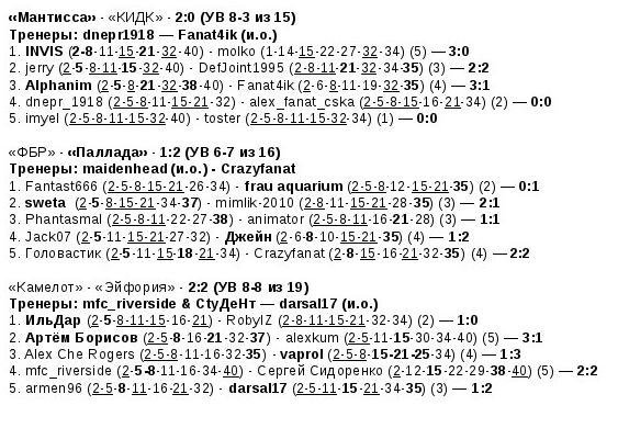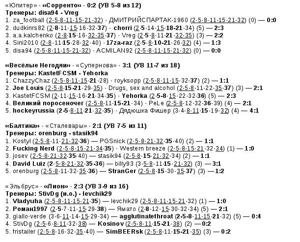 по 6 голов - Kostyl (Балтика), agglutinatethroat (Лион), billy93 (Сталевары), vaprol (Эйфория)