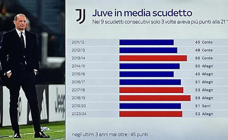 «Отношения черно-белой тифозерии и Аллегри никогда не были логичными. Возглавив команду, тренер выиграл 5 чемпионатов из 5, два раза дошёл до финала Лиги Чемпионов, взял 6 кубков, но был критикуем с утверждением: такая сильная команда обязана побеждать в Италии, играя в более зрелищный футбол.