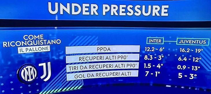 Иллюстрация: PPDA - среднее количество передач, которые позволяют сделать сопернику перед отбором мяча, строка 2 - среднее количество отобранных мячей на чужой трети поля, 3- среднее количество ударов после отборов, 4 - голы после высоких отборов. Рядом - место в Серии А по показателю.