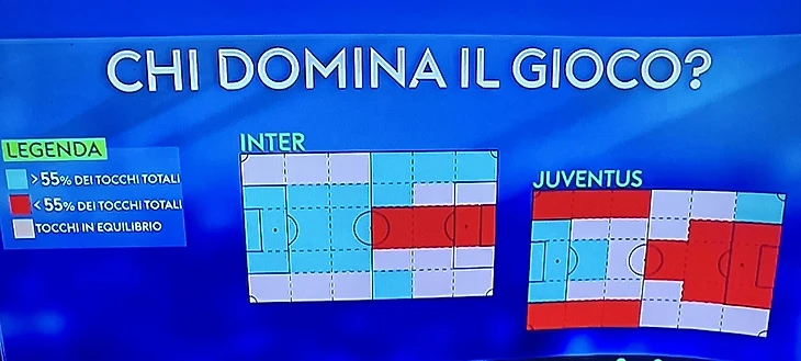 На иллюстрации белый цвет - равенство с оппонентами, голубой цвет - зона доминирования. Для «Интера» - левый фланг атаки, собственная штрафная и зона перед ней, фрагмент справа после центральной линии. Для «Юве» - своя штрафная, зона перед ней, а также прямоугольник слева в атаке у углового флажка.