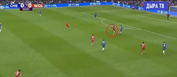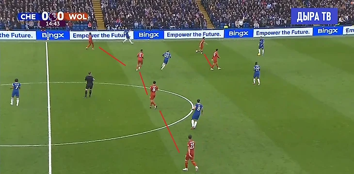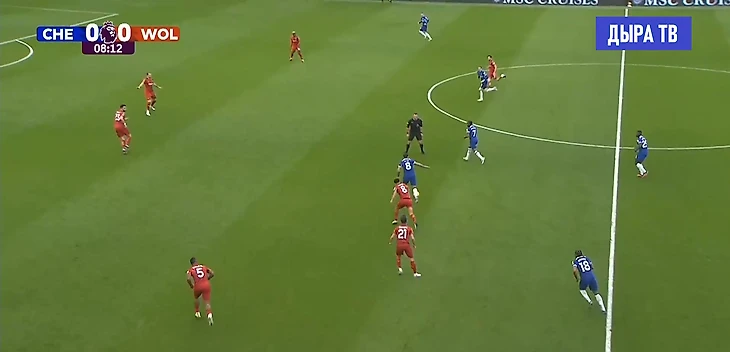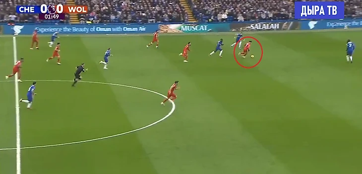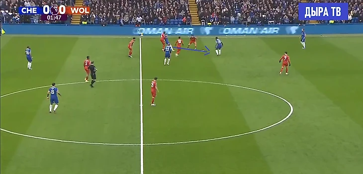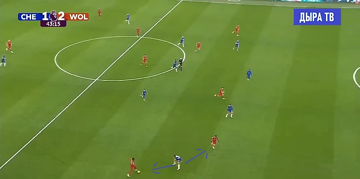 Прессинг «Челси», что неудивительно, был выше, но никакой пользы команде Почеттино это не принесло. «Волки» вовсе не настаивали на владении, в редких случаях им удавалось спокойно выйти из-под прессинга как на скриншоте ниже.