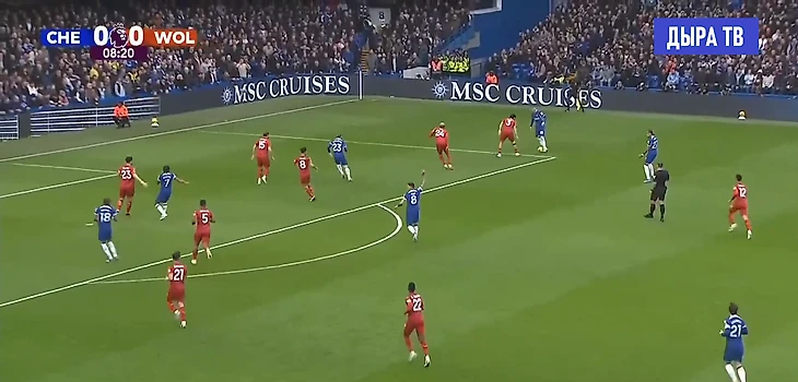 «Челси» откровенно плохо начал матч. И это несмотря на уровень соперника и отсутствие высокого прессинга от него. «Вулвз» вступали в прессинг ближе к центру поля, но даже этого им хватало для создания неприятностей сопернику. Уже на первых минутах Кайседо и Палмер совершили довольно серьезные ошибки. Ничего страшного после этого не произошло, но это уже были первые тревожные звоночки.