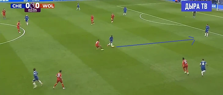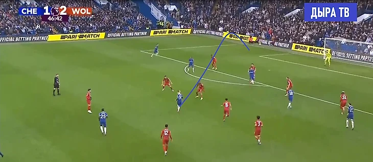 Второй тайм «Вулвз» начал с высокого прессинга и сразу же пробил в створ, после чего отошел немного назад. И это показательный момент. «Вулвз» не прессинговал высоко постоянно, но стоило им это сделать – у «Челси» начинались крупные проблемы. А ведь проблемы были и без этого.
