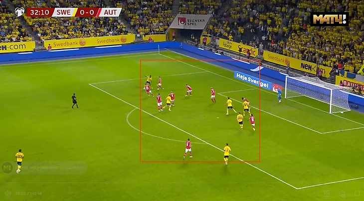 Нельзя не отметить и высокое построение защиты, которая часто отодвигает линию к району центрального круга, создавая положение искусственного офсайда. Но это не строгое правило, потому что нередко можно наблюдать, как Австрия прижимается к воротам, если соперник захватил инициативу на их половине поля. В данном случае прессинг практически отсутствует.