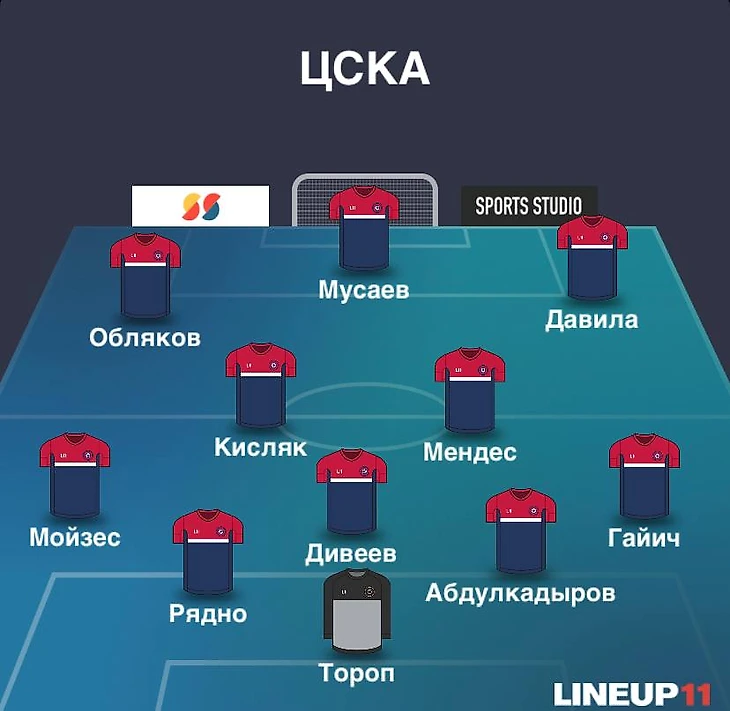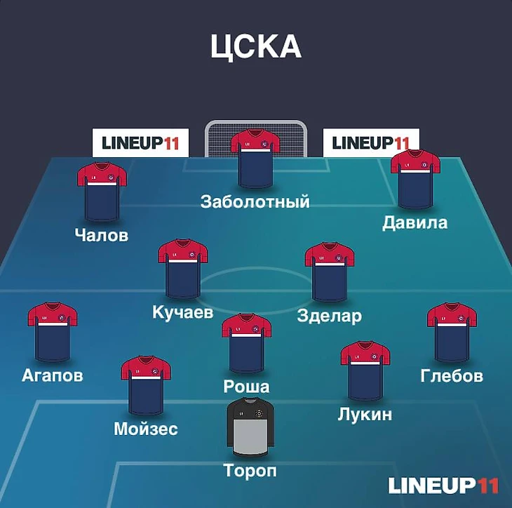В центр поля стартовую двойку составят Кучаев и Зделар, которые на данный момент являются более резервными вариантами. Поменяют их Кисляк и Мендес. Изначально в атаке появится Заболотный, Чалов и Давила, двоих из них сменят Обляков и Мусаев.