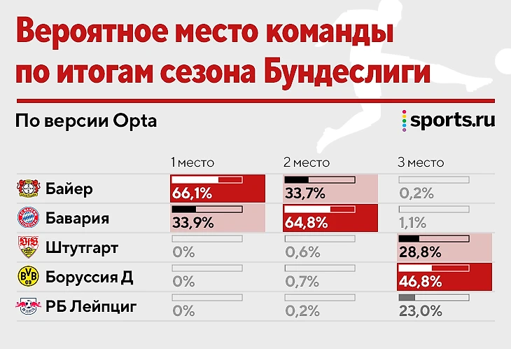 Перед началом сезона та же система оценивала шансы на золото «Байера» в десятые доли процента – меньше единицы. Выше была не только «Бавария» (52,4%), но и «РБ Лейпциг» (33,3%) с «Боруссией» (12,2%)
