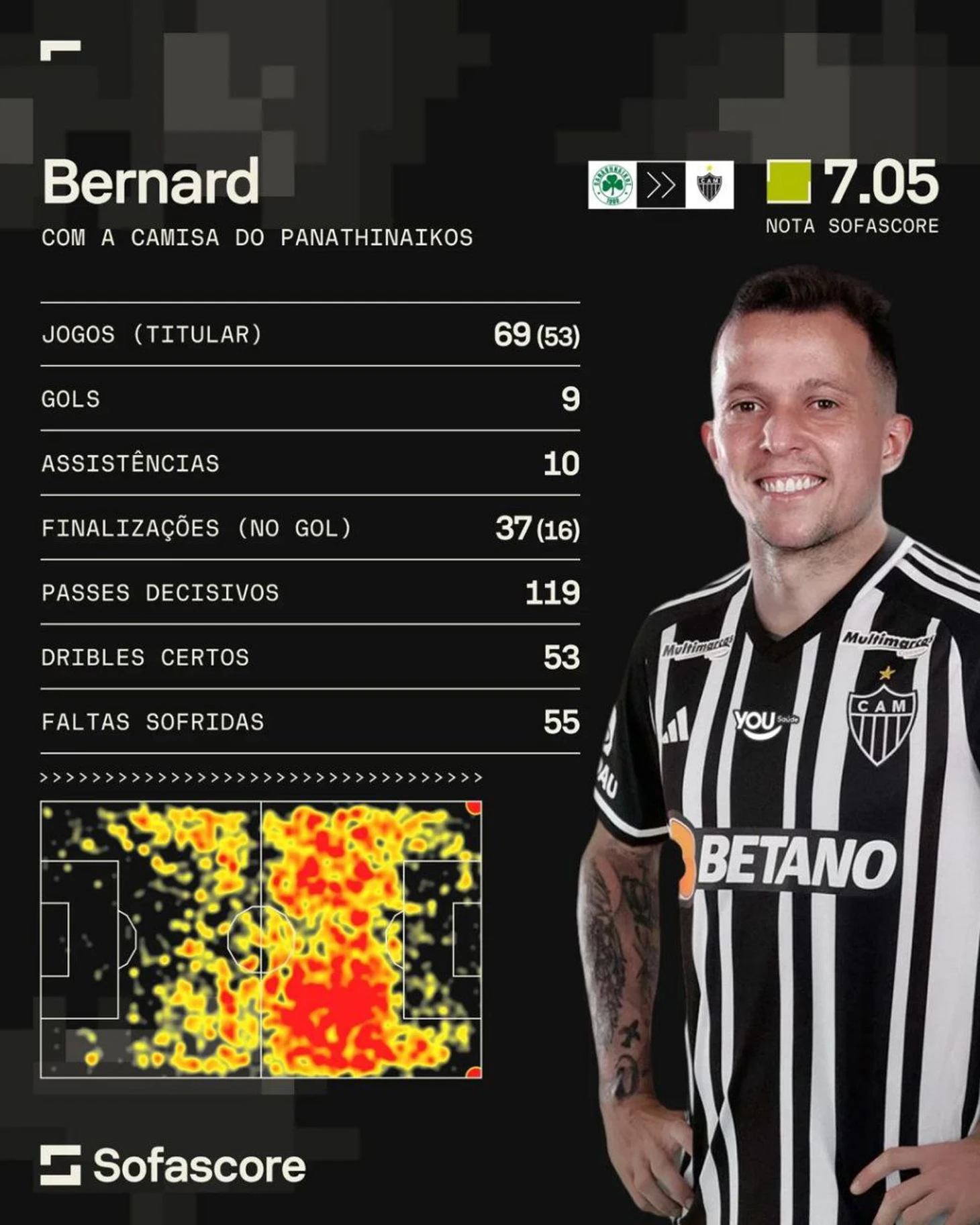Теперь о трансферах. В «Атлетико Минейро» вернулся экс-игрок сборной Бернард. Думаю, должны его помнить по «Шахтеру» и «Эвертону». Последние сезоны он провел в Греции, в «Панатинаикосе».