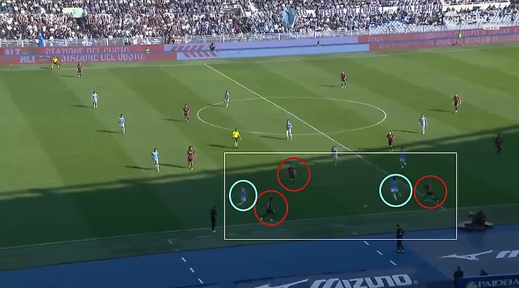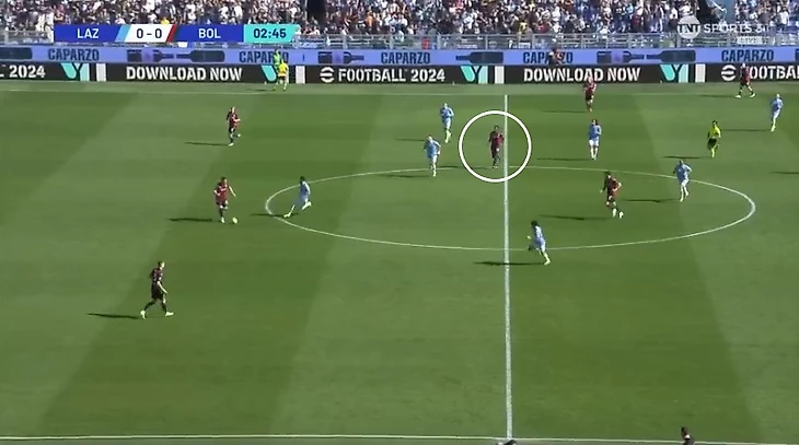 Билд-ап «Болоньи» и расположение «Лацио». «Болонья» в данной игре и, по всей видимости, как и всегда, выстраивалась в фазе билд-апа по схеме 3-2. Пош (правый защитник) всегда был крайним справа, а Эль Аззузи (опорник) зачастую находился чуть выше тройки, низко не опускался и отвечал за продвижение мяча. Остальные игроки своё расположение меняли. Иногда Лукуми уходили в опорную зону (скрин 1), иногда Кристиансен отыгрывал роль ложного крайнего защитника (скрин 2), а в каких-то моментах и Бёкеме (второй центральный защитник) сдваивал опорную зону вместе с Эль Аззузи.Хозяева в свою очередь старались сохранять компактность. В первую очередь за это отвечали вингеры команды (Андерсон и Исаксен). Данное расположение вы можете увидеть на третьем скрине ниже.