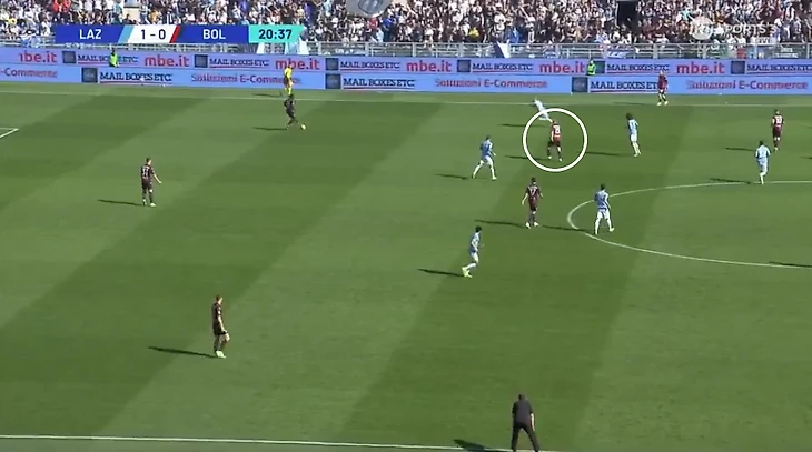 Гол «Лацио». К сожалению, с голом «Лацио» нет скринов. Здесь важно вспомнить одну фразу из начал статьи про то, что футбол - игра слабого звена. В этом матче было два эпизода, когда Лукуми подвёл свою команду и один из них как раз привёл к голу. Логично, учитывая, что «Болонья» любит владеть мячом ближе ко второй трети поля. Хозяева забили два гола, но один из них был отменен из-за положения вне игры у Иммобиле. Римляне могли забивать в этой игре трижды и, в этом третьем эпизоде судья бы уже не помешал голу свершиться, но сейв совершил Лукуми, который исправился за привоз, правильно выбрав позицию в створе ворот. Голы «Болоньи». 1) Слабое звено в этом матче было и у «Лацио». Проведель и кто-то из центра поля (точно не помню кто именно) неаккуратно отыгрались друг с другом в одном из эпизодов. Конечно, нельзя не выделить прессинг со стороны опорного полузащитника «Болоньи» Эль Аззузи, который шёл за своим игроком вплоть до чужой штрафной площади. По итогу именно он и забил гол.