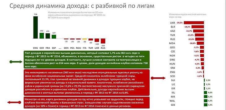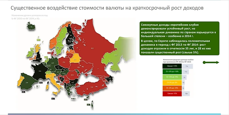 Начало падения российского футбола имеет прямую зависимость с неэффективной селекцией и со средней динамикой падения доходов на -160 млн евро под воздействием упадка национальной валюты в 12 кратном размере относительно доходов. На рисунках продемонстрировано начало регресса относительно мировой индустрии спорта.