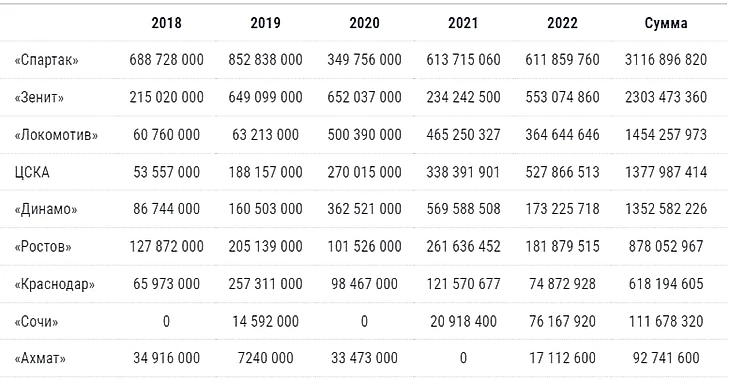 «Самую большую выручку в 2022 г. задекларировал петербургский «Зенит» – 13,76 млрд руб., при этом в документах указано, что владельцы, т. е. компании из группы «Газпром», вложили в клуб 960,4 млн руб. Данных об этом в отчетности не было с 2019 г., нынешний показатель – рекордный. Выручка «Зенита» выросла на 9,6% по сравнению с 2021 г. (12,6 млрд руб.), при этом увеличилась и сумма убытка – на 61,4% до 647,9 млн руб.