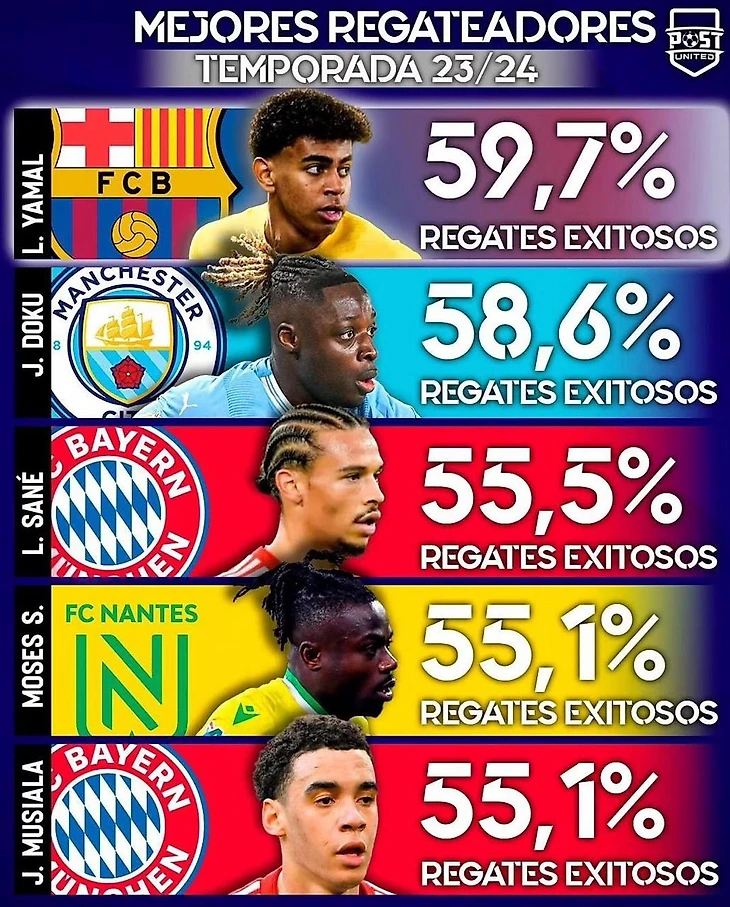 Ламин Ямаль - официально лучший дриблер этого сезона: в ТОП-5 двое игроков «Баварии»