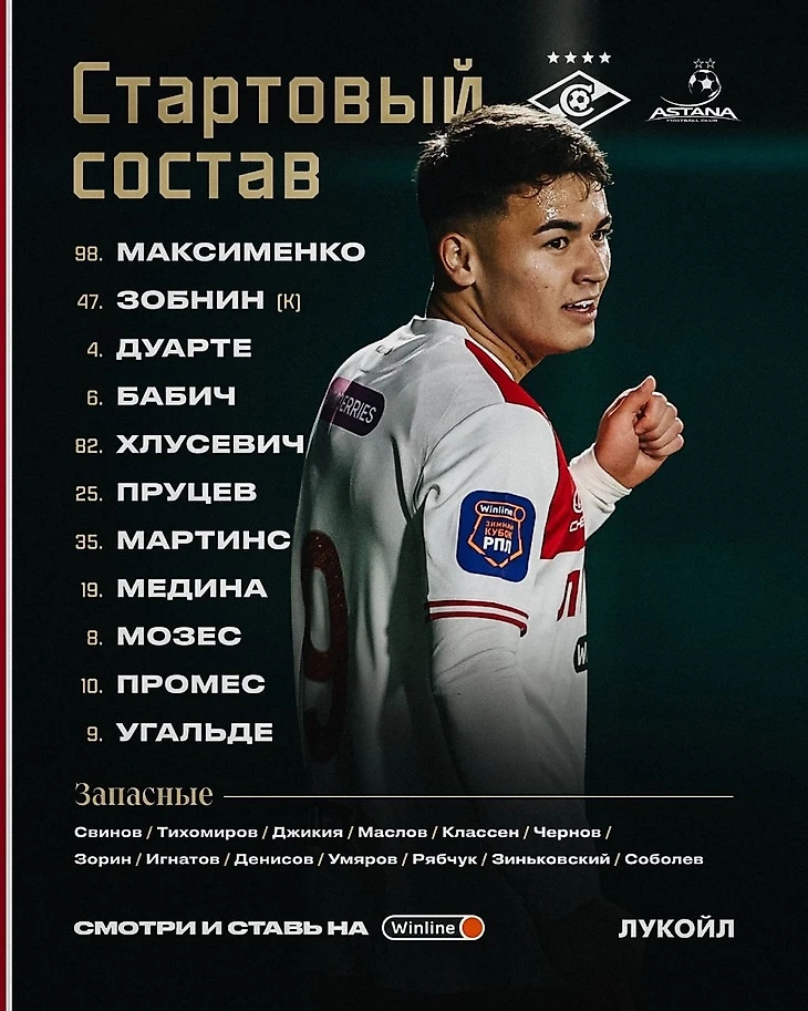 Делать какие-то глобальные выводы из товарищеских игр — дело неблагодарное, но на определенные детали обратить внимание стоит. Главный месседж Абаскаля в двух этих матчах заключался в составах. Во вторник с чемпионом Киргизии вышел скорее второй состав. На это указывают многие факторы. Здесь и практически не имеющие игровой практики Классен и Маслов, которые вроде бы уже были одной ногой в аренде; и вернувшийся из этой самой аренды Зорин — самый молодой из полевых игроков; ну и в конце концов пара центральных защитников Джикия - Чернов. Центр обороны — одна из двух ключевых спартаковских тем этой зимы, и Абаскаль двум россиянам предпочитает Бабича и Дуарте. Это очевидно и бесспорно. Собственно, серб и парагваец вышли на игру с «Астаной». Справа в обороне, как и во всех матчах зимнего турнира, расположился Зобнин, слева — Хлусевич. В центре поля — Мартинс и Пруцев, по краям — Медина и Мозес, впереди — Промес и Угальде. Все это в формате 4-4-2, за зиму мы к этой схеме привыкли.