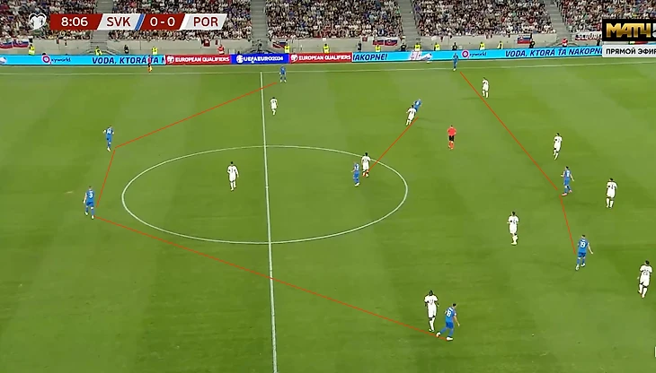 Словаки исповедуют неторопливый футбол. Им неудобен высокий темп, поэтому они стараются навязывать основную борьбу в центре поля, что объясняет небольшой разрыв между линиями.