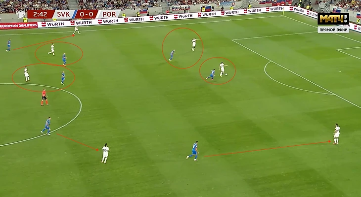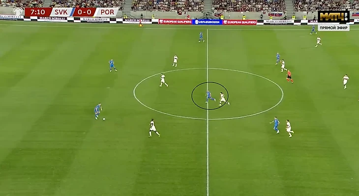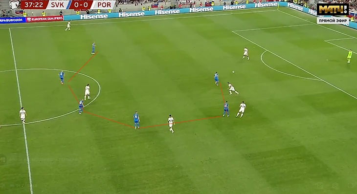 В отличии от шотландцев, словаки не стараются отобрать мяч сразу после его потери. Они используют именно командный прессинг, нацеленный на то, чтобы перекрыть доступные варианты для передачи.