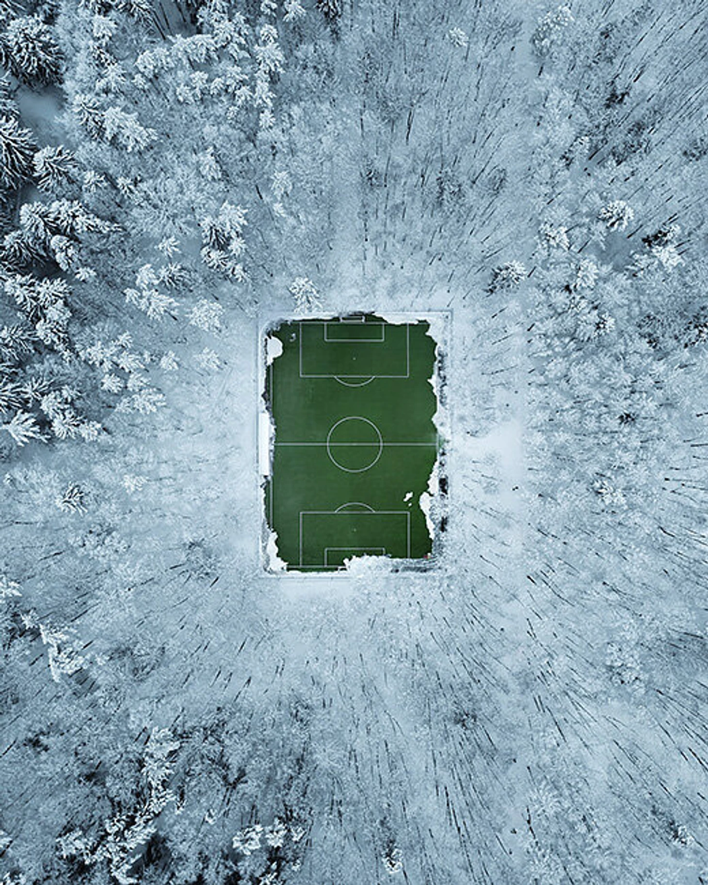 Зимнее фото поля сделал известный аэрохудожник России. Он снимает необычные площадки по всему миру