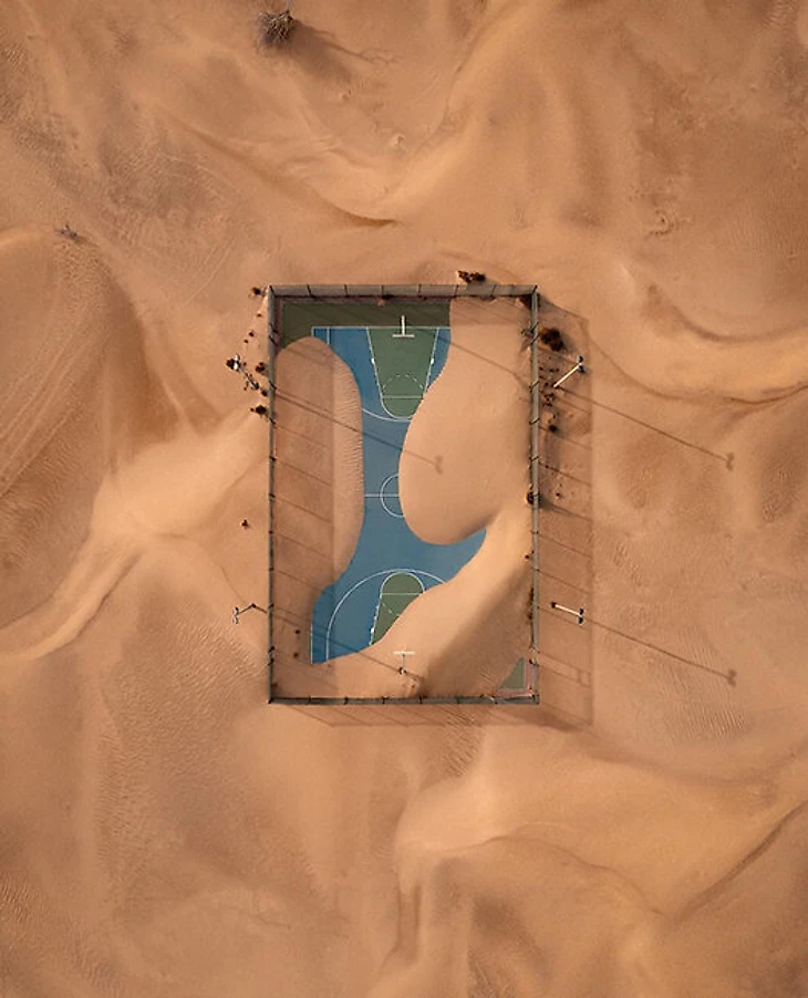 – А где это снял? Баскетбольная площадка, занесенная песком посреди пустыни.