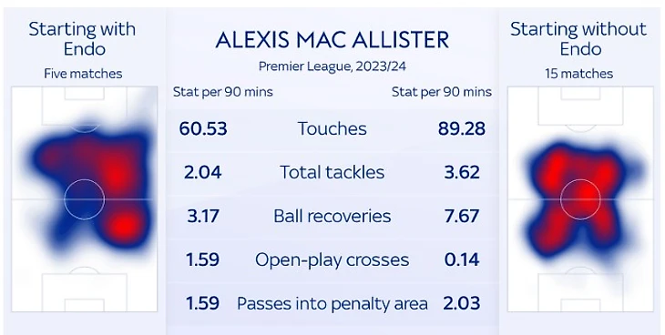 В пяти играх, которые Мак-Аллистер провел перед Эндо в этом сезоне, он в среднем делает на 29 касаний меньше, чем когда играет в центре поля.