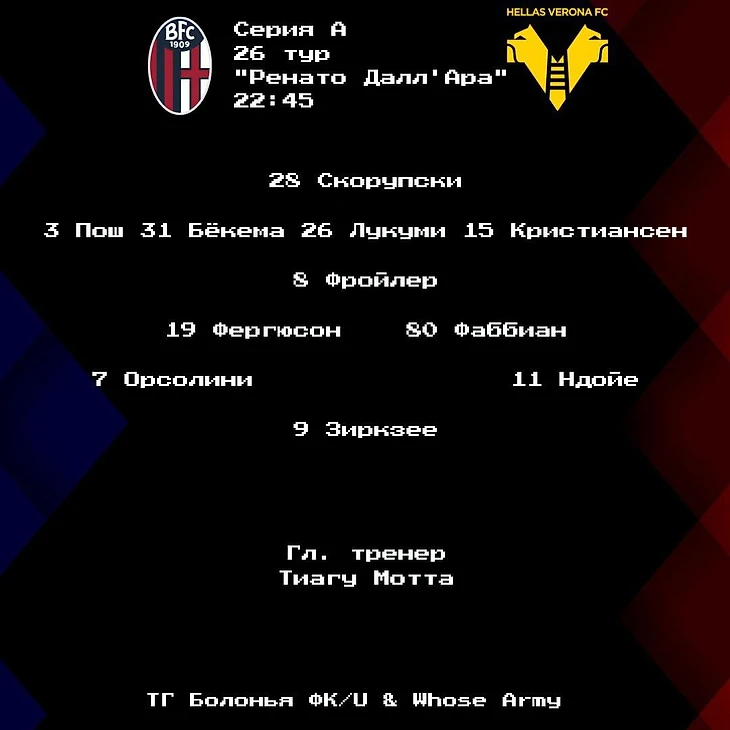 Исход - «Результат имеет значение, мы все это знаем, он действительно важен в нашей игре, если не самый важный, и на нас лежит ответственность, поскольку мы играем, чтобы доставить удовольствие нашим болельщикам. Завтра все выйдут на поле, чтобы показать себя с лучшей стороны и помочь друг другу, готовые сражаться, играть как можно лучше и добиться результата, которого мы все хотим. Завтрашний матч для нас очень важный, и мы думаем о «Вероне» и о том, что нам следует делать и чего избегать, как вести себя, чтобы иметь возможность доставить удовлетворение себе и нашим тифози, которые этого заслуживают. Я благодарю болельщиков за их внимание и особенно Джованни Бертелли за его петицию (о том, чтобы Мотта остался в «Болонье», прим.)