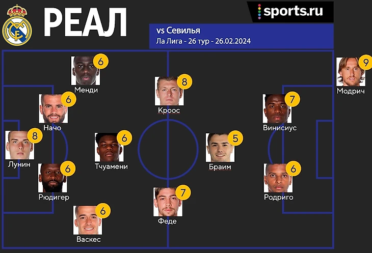 Тони Кроос — 8. Если бы не шикарный выход Луки на замену, то назвал бы именно немца лучшим игроком встречи. 18 точных дальних передач (лучший результат в Ла Лиге с 2019 года, тогда сам же Кроос исполнил 20), 4 ключевые передачи и 7 выигранных дуэлей из 10. За счет очень своевременных переводов Крооса во фланги, «Мадрид» наращивал скорость в финальной трети и ловил «Севилью» на перестроениях в обороне. Чувство ритма игры у Тони поражает даже сейчас, когда ты знаком с его футболом уже более 10 лет. Каждый раз ощущение, что так просто не бывает.