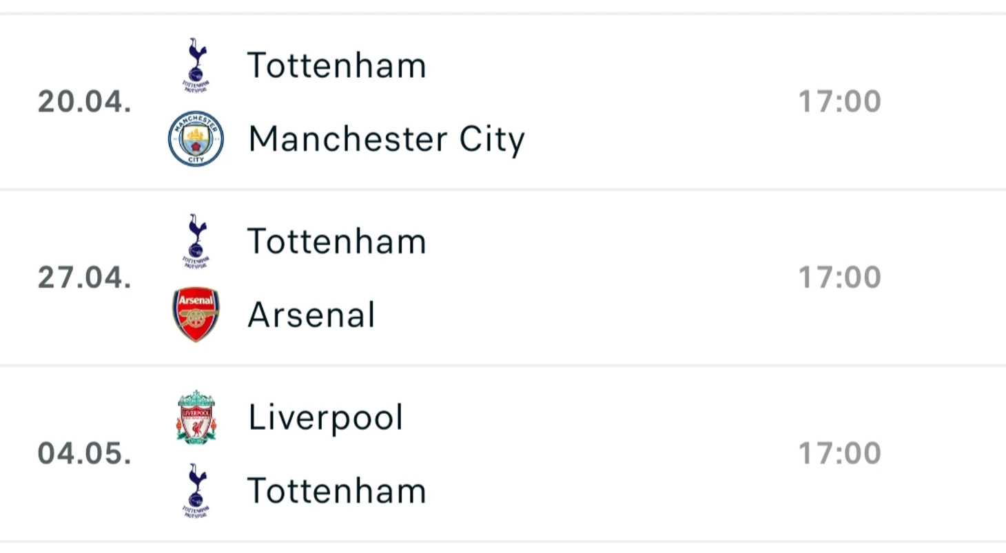 И вот после всех приведенных аргументов хочется сказать, что ни одна из этих команд не определит исход чемпионской гонки. Потому что «серым кардиналом» гонки за чемпионство станет «Тоттенхэм». Представляю вашему вниманию расписание на 34-36 тур подопечных Постекоглу.