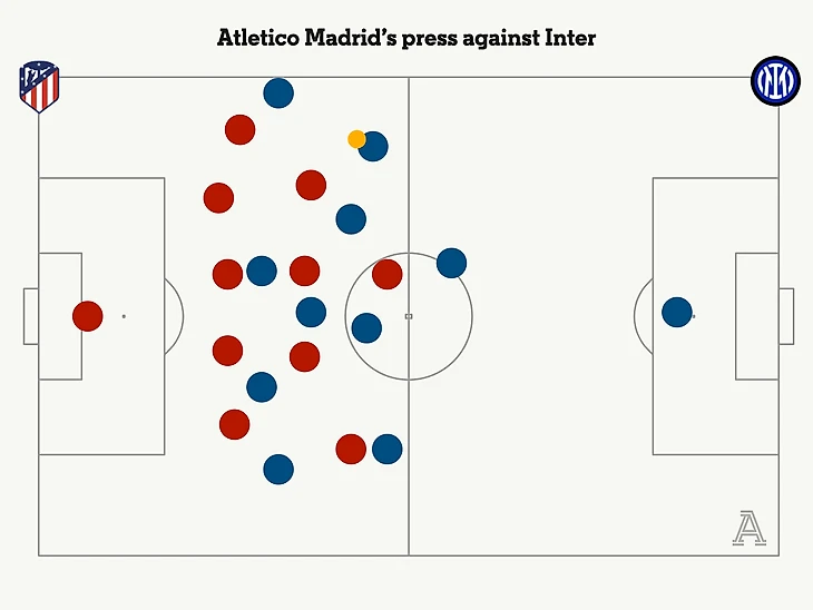 Немногие команды играют в этом среднем блоке и в высоком прессинге лучше, чем «Атлетико Мадрид» Диего Симеоне. Играя на выезде с миланским «Интером» в Лиге чемпионов на прошлой неделе, они могли сохранить игру в осторожной схеме 5-4-1, которая давала моменты для прессинга.