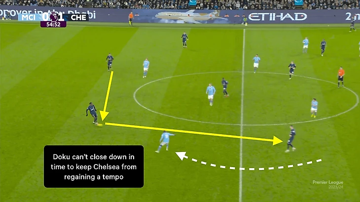 Когда «Челси» перемещал мяч по задней линии, Джереми Доку обогнул центрального защитника «Челси» Акселя Дисаси, чтобы заставить его развернуться во внутрь - схема, которую Гвардиола разработал для своей команды, но ловушка была слишком медленной, чтобы накрывать вовремя. У Дисаси было пространство, чтобы поднять голову и восстановить темп с помощью адресной передачи Коулу Палмеру в полуфланг, что дало Палмеру долю секунды, необходимую для того, чтобы сбить с толку Джулиана Альвареса и освободиться от опеки между линиями.
