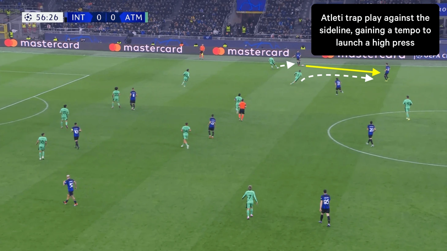 К тому времени, как центральный защитник «Интера» Стефан де Врий оторвался от Альваро Мораты, «Атлетико» переключился с пассивной зональной защиты на полноценную персональную опеку «игрок-с-игроком», вынудив на отчаянный пас по коридору, где ловушка и захлопнулась. Поскольку «Интер» был в замешательстве, последовавшая контратака создала один из лучших голевых моментов в игре.