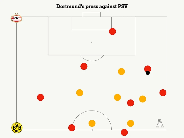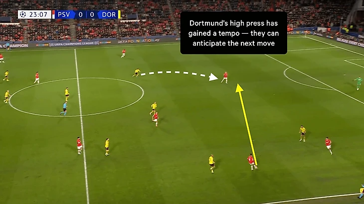 ПСВ ничего не оставалось, как отыграться назад к штрафной. Санчо продолжил движение на вратаря. Небольшой кикс дал Дортмунду несколько секунд, необходимых им, чтобы закрыть ловушку прессинга у дальней боковой линии и отобрать мяч, чтобы забить гол в быстром переходе.