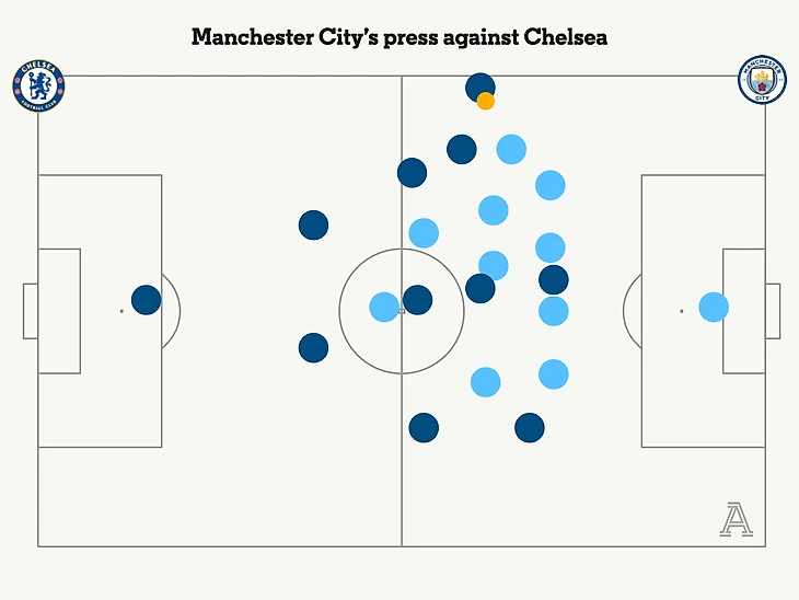 «Манчестер Сити» раньше был самой агрессивной командой в использовании прессинга в Премьер-лиге, но в последние пару сезонов они стали все более осторожно подходить к выходу из своего среднего блока, опустившись на 10-е место в лиге по показателю прессинга, известному как передачи на защитное действие (PPDA, который подсчитывает, сколько передач команда позволяет сделать сопернику, прежде чем попытаться вернуть мяч). В матче с «Челси» на прошлых выходных можно было увидеть, что беспокоит Пепа Гвардиолу.