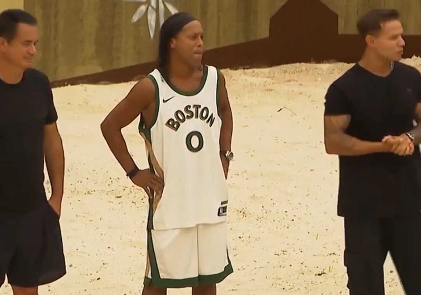 На песок Роналдиньо вышел в майке баскетболиста «Бостон Селтикс» Джейсона Тейтума. Многие считают его главным кандидатом на приз MVP в этом сезоне НБА прямо сейчас. Респект от легенды – в копилку.