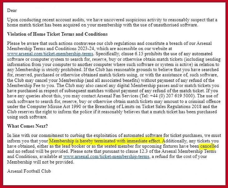 27 февраля случился холодный душ. Письмо от клуба сообщало, что мое членство приостановлено, а все билеты аннулированы (у меня был только один – на «Порту») без права на возврат уплаченных денег. Причина: подозрение в использовании запрещенного ПО для покупки билетов. Вот это зловещее письмо.