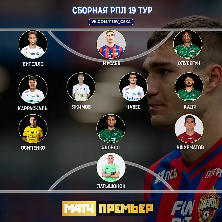 Тамерлан Мусаев единственный из ЦСКА в символической сборной 19-го тура Российской Премьер-Лиги