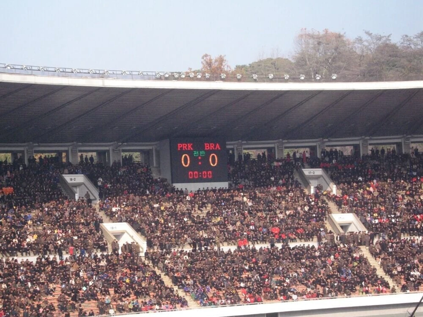 На одной из фотографий, сделанной перед началом матча, изображено устаревшее электронное табло. На нем написано: «PRK 0-0 BRA». Это Северная Корея против Бразилии.