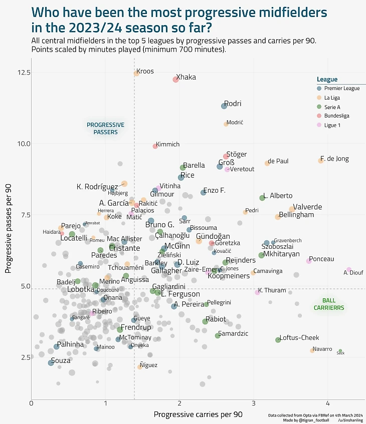 Обратимся к полузащитникам. Любитель футбола, воспользовавшийся данными Opta, построил график, на котором показаны сильнейшие хавбеки топ-5 лиг Европы по двум показателям - продвижение мяча вперед (Progressive carries) и точные пасы/рывки с мячом, обеспечивающие продвижение команды к воротам соперника (Progressive passes).
