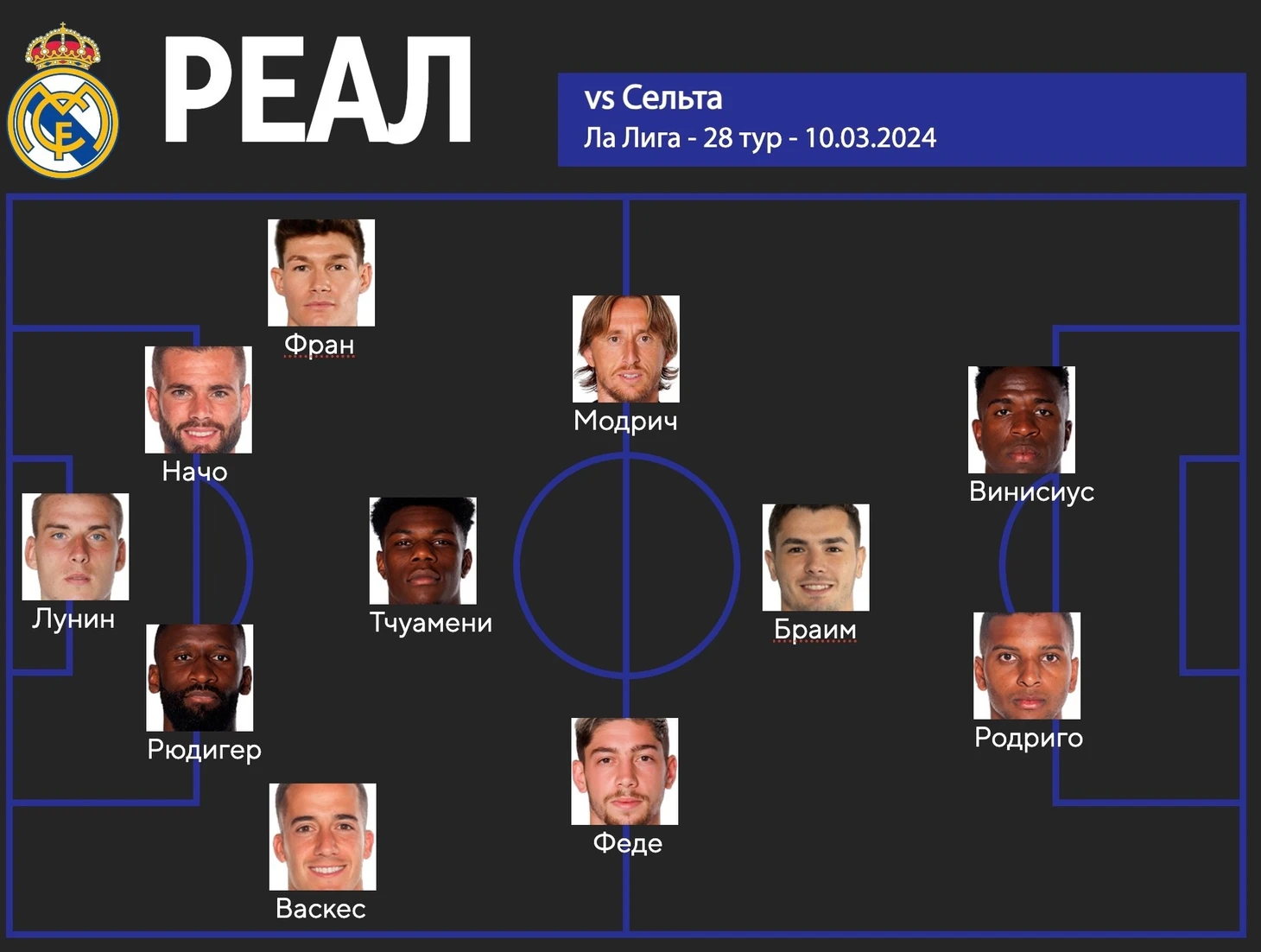 По сравнению с матчем против «Лейпцигом» ожидается пять изменений: Фран вместо Менди, Васкес вместо Карвахаля, Модрич вместо Крооса, Браим вместо Камавинги и Родриго вместо Беллингема.