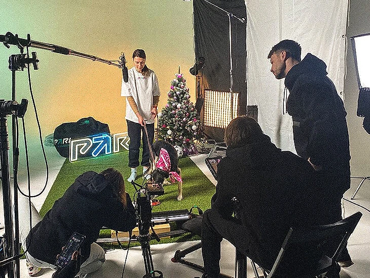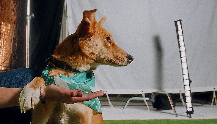 Фонд подобрал для проекта девять собак из приюта «Зоорассвет» в Новогирееве, поэтому студию мы арендовали неподалеку: не хотелось, чтобы долгая дорога заставила четвероногих нервничать. Кроме того, для легкой адаптации собак и во избежание конфликтов, волонтеры привозили подопечных по одной или парами. Все эти меры определенно помогли нам – собаки не проявляли агрессию, страх, напряжение или другие негативные эмоции. В итоге мы уверенно и быстро двигались по раскадровке и уложились в один съемочный день.